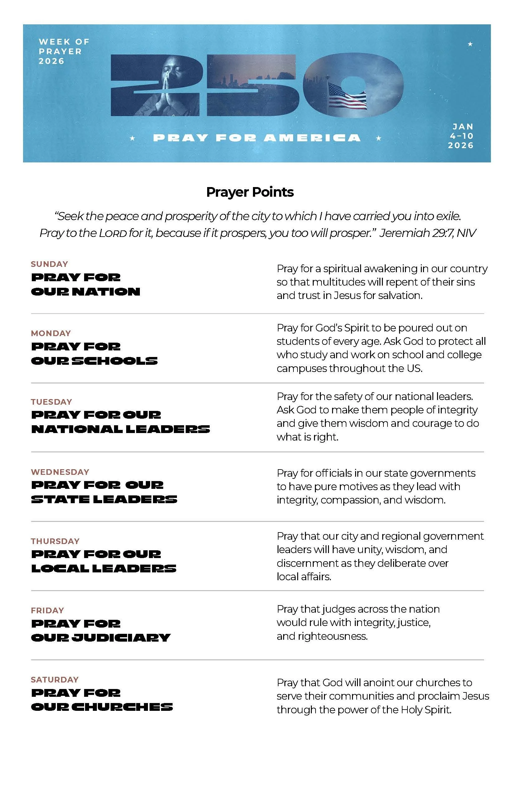 The Assemblies of God designates the first full week of each year as a week of prayer. Join us January 4-10, as we launch 2026 in focused prayer.
